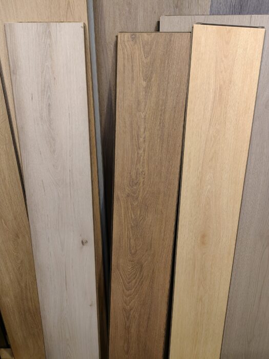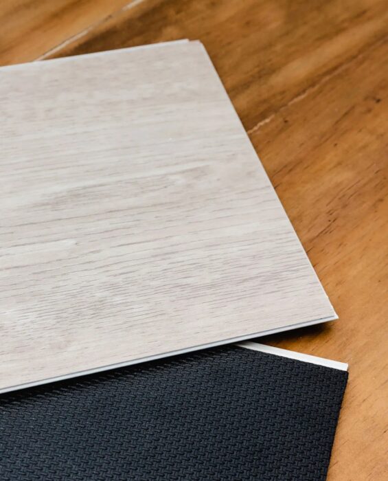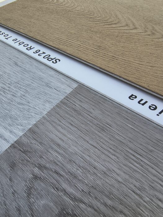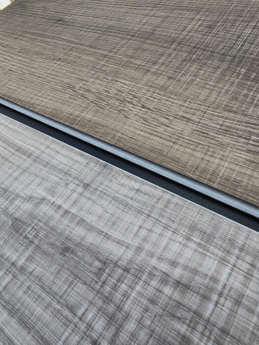 Piso Vinilico SPC 5mm. Standard (4mm. + IXPE 1mm) con manta. De 178 x 1220mm. Teka, Astana, Natural y Gris.